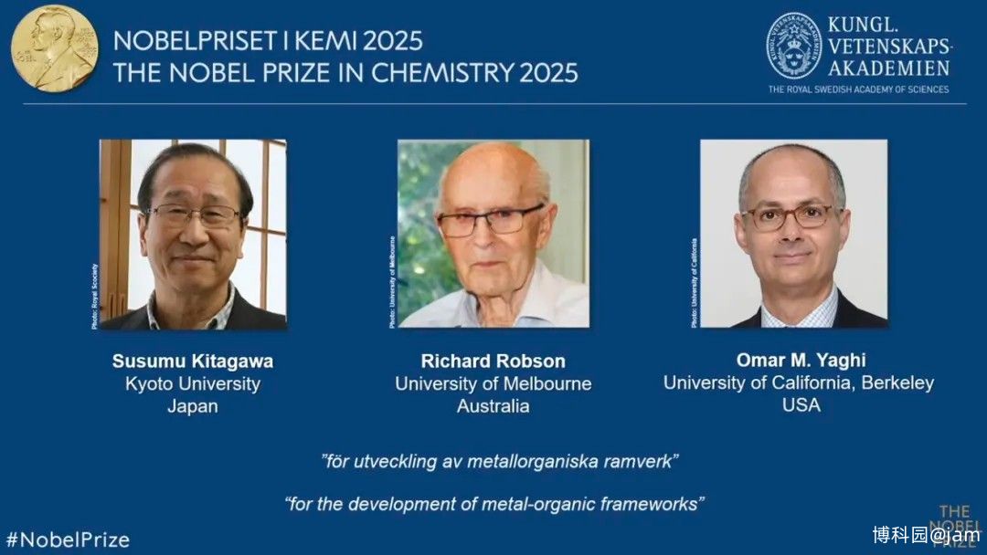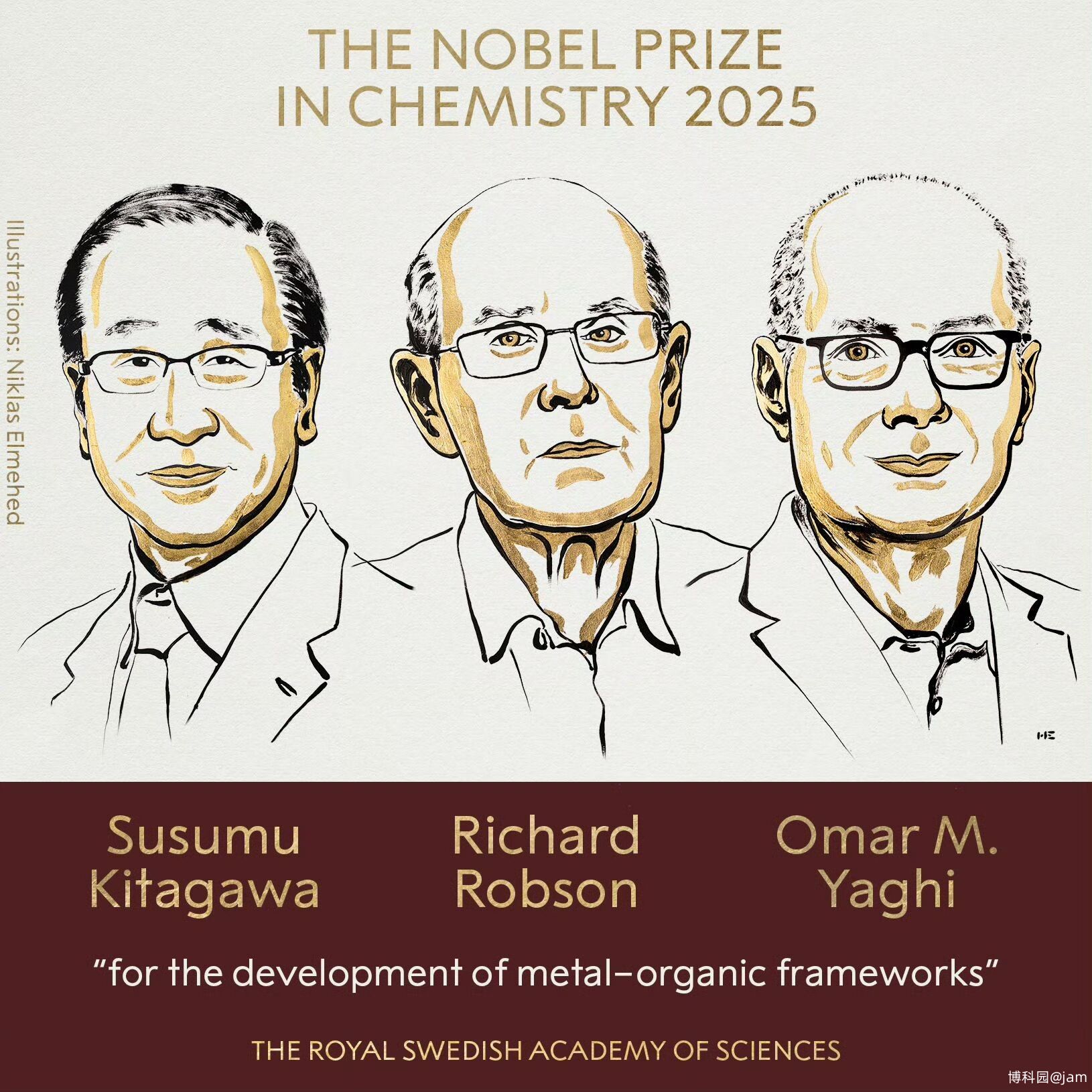北京时间10月8日下午5时45分许,2025年诺贝尔化学奖揭晓!由北川进Susumu Kitagawa、理查德.罗布森Richard Robson、奥马尔·M·亚吉Omar M. Yaghi 三人分享,以表彰他们“在金属有机框架(metal–organic frameworks,MOFs)领域的开创性贡献”