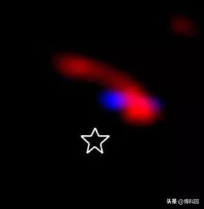 - LkCa 15周围清除区域的中心部分扩展视图,显示了两个重建图像的合成(蓝色:2.1微米,2010年11月;红色:3.7微米)用于LkCa 15。中心星的位置也被标记出来。图片:Kraus & Ireland