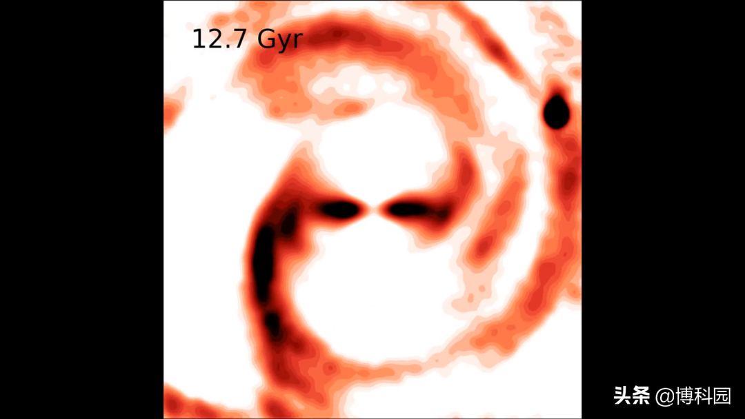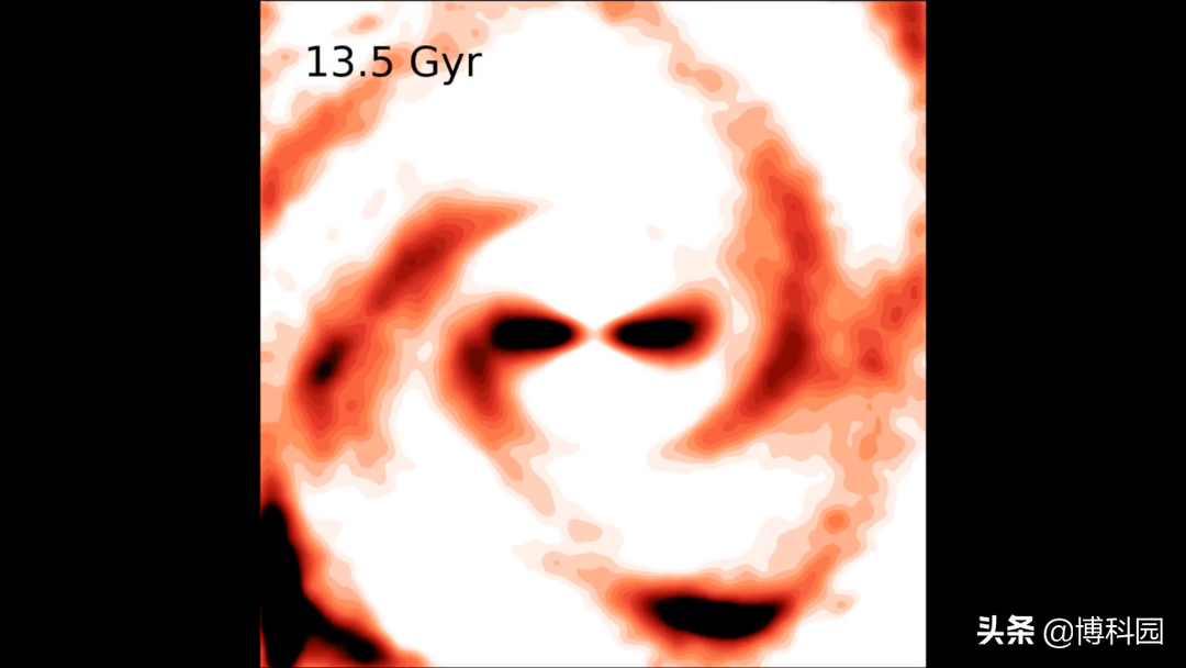 图示:来自银河系模拟的快照,中间的棒状结构和旋臂被认为是以不同的速度旋转,如果它们断开连接,将显示其真实且较小的结构(左图);每次它们相遇时,棒状结构看起来更长,旋转速度更慢(右)。