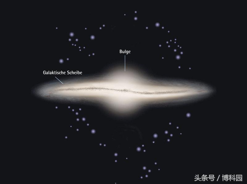曲线:从侧面看,星系看起来像一个稍微弯曲的轮子,直径约为10万光年,厚度仅为5000光年,中央有一个明亮的球形凸起。图片:Helmut Rohrer