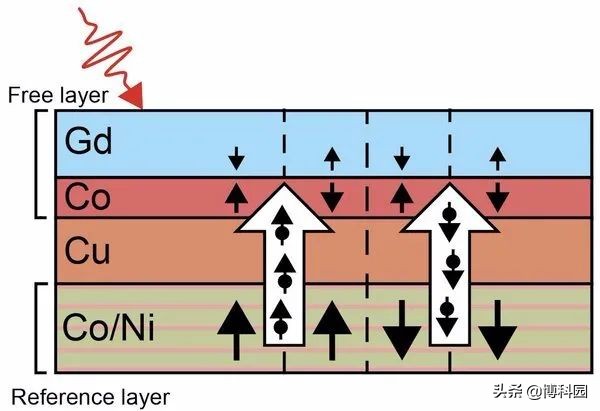 在实验中,研究人员设计了一种由三层组成的写入系统,由于钴和镍的制成或防止自由层中自旋转换的铁磁参考层,导电铜(Cu)间隔层或GaP层,以及可光学开关的Co/Gd自由层,结合层的厚度小于15 nm。一旦被飞秒激光激发,参考层就会在不到一皮秒的时间内退磁。然后,与参考层中自旋相关的一些丢失角动量被转换成由电子携带的自旋电流,当前中的自旋与参考层中的自旋方向对齐。