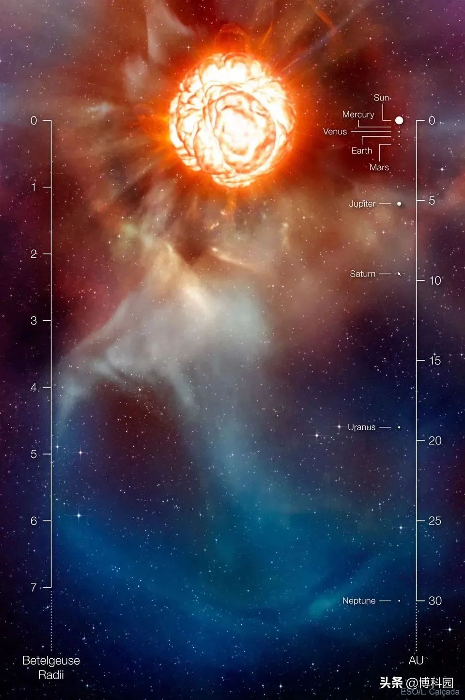 参宿四是一颗所谓的红超巨星,与太阳相比,它的质量大约大20倍,体积大约大1000倍。如果放在太阳系的中心,它几乎可以到达木星轨道。由于它的体积太大,恒星表面受到的引力比同等质量但半径较小的恒星要小。因此,恒星脉动可以相对容易地弹出这样一些恒星的外层。释放出的气体冷却并发展成天文学家称之为尘埃的化合物。这就是为什么红巨星是宇宙中重元素的重要来源,行星和生物最终都是从宇宙演化而来。