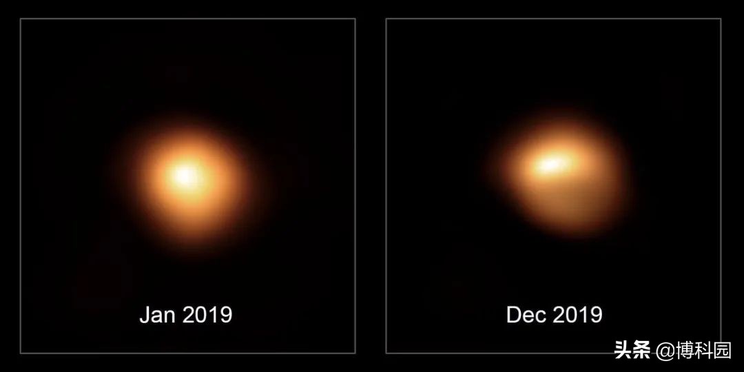 然而,温度变化对沿电磁频谱发射的辐射的影响不同,在可见光和亚毫米波中测量到的变暗,因此是参宿四平均表面温度下降的证据,研究人员将其量化为200K。来自欧洲南方天文台(ESO)的合著者Peter Scicluna解释说:然而,温度分布不对称的可能性更大。2019年12月参宿四相应高分辨率图像显示了不同亮度的区域,加上新研究结果,这清楚地表明,巨大的恒星黑子覆盖了可见表面的50%到70%,温度低于更亮的光球层。