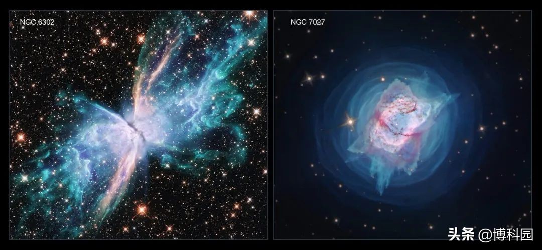 哈勃太空望远镜拍摄的两张行星状星云新图像,展示了哈勃望远镜惊人的成像能力。这些图像描绘了两个年轻的行星状星云,NGC6302(蝴蝶星云)和NGC7027。这两个星云都是已知的尘埃行星状星云之一,都含有异常大量的气体,这使得它们成为一组研究人员平行研究的有趣对象。作为核聚变引擎,大多数恒星都过着数亿到数十亿年的平静生活。
