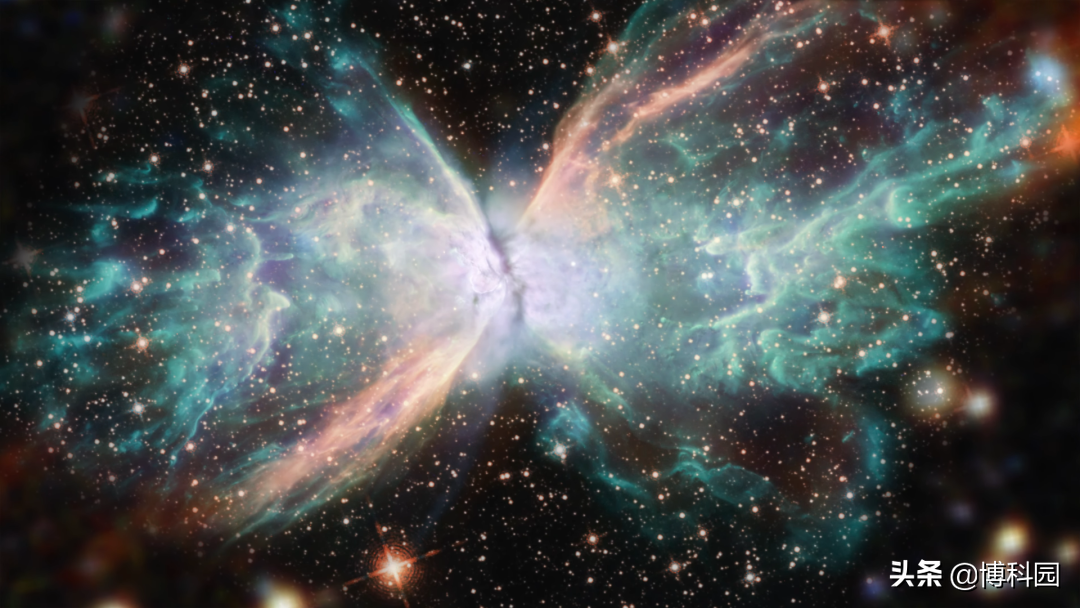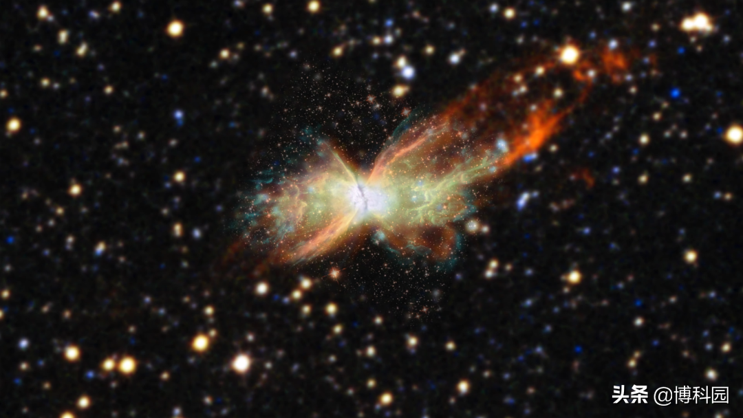 NGC6302俗称蝴蝶星云,在图像中显示出一个明显的S形图案,呈橙红色。想象一下,一个草坪洒水器疯狂旋转,喷出两条S形的溪流。在这种情况下,它不是空气中的水,而是一颗恒星高速吹出的气体。而“S”只有在被哈勃相机滤光片捕捉到时才会出现,该滤光片记录了单个电离铁原子的近红外发射。这种铁的发射表明,在活动星系核和超新星遗迹中,最常见的是慢风和快风之间的能量碰撞。西雅图华盛顿大学的研究小组成员布鲁斯·巴利克解释说: