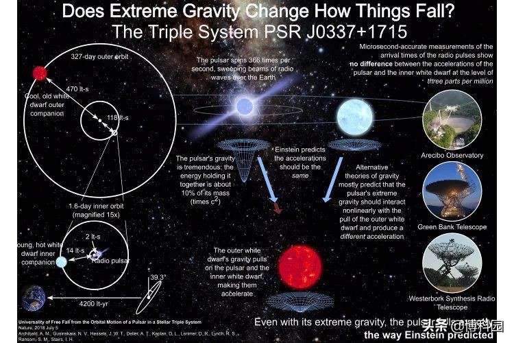 然而,量子力学和广义相对论之间的不一致性,或者暗物质和暗能量在宇宙构成中占据主导地位的谜题等一些暗示,让许多物理学家认为,广义相对论毕竟可能不是引力的终极理论。脉冲星J0337+1715是一颗中子星,其核心质量是太阳的1.44倍,已经坍塌成一个直径只有25公里的球体。对脉冲星J0337+1715的观测表明,它绕着两颗重力场弱得多的白矮星运行。在新发表在《天文学与天体物理学》期刊上的新研究结果,证明了自由落体原理普遍性是正确的。