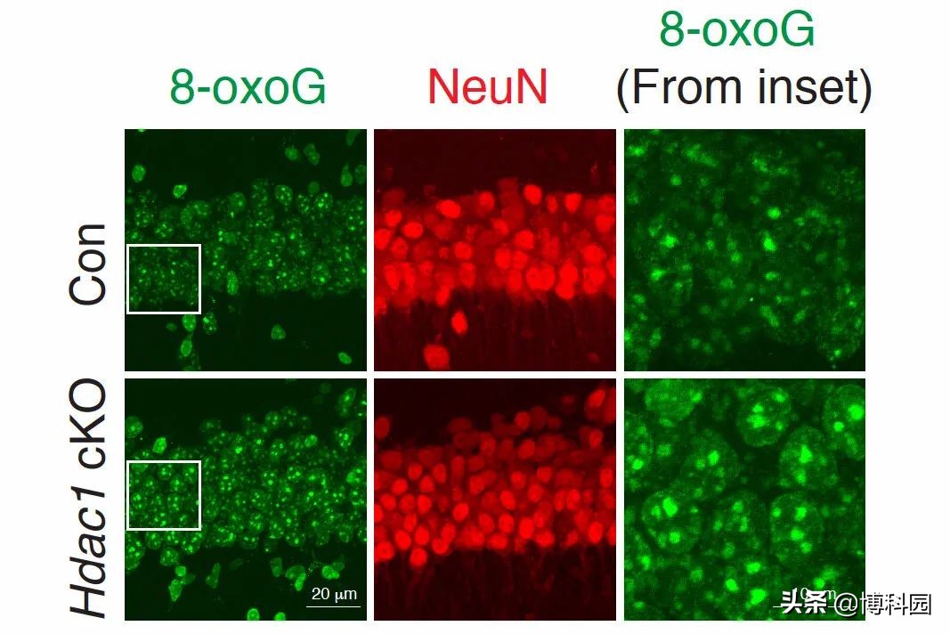在小鼠生命的头几个月里,与正常小鼠相比,它们的DNA损伤水平或行为没有明显差异。然而,随着老鼠年龄的增长,差异变得更加明显。DNA损伤开始在HDAC1缺陷的小鼠身上积累,它们也失去了一些调节突触可塑性的能力,即神经元之间连接强度的变化。缺乏HCAC1的老年小鼠在记忆和空间导航测试中也表现出损害。研究人员发现,HDAC1缺失会导致一种特殊类型的DNA损伤,称为8-氧鸟嘌呤损伤,这是氧化性DNA损伤的标志。