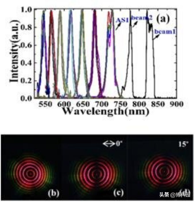 该方法也可用于产生其他偏振态和其他光谱范围的矢量光束,这将有利于多色超快矢量光束的进一步产生和应用。而且这项工作得到了国家自然科学基金、仪器研制项目和中科院战略重点研究计划的资助。研究首次利用级联四波混频(CFWM)在两个强矢量飞秒脉冲泵浦的玻璃板中,简单地产生了新颖的多色同心环形超快矢量光束(MUCAU-VB)。原理验证实验表明,基于级联四波混频工艺同时获得: