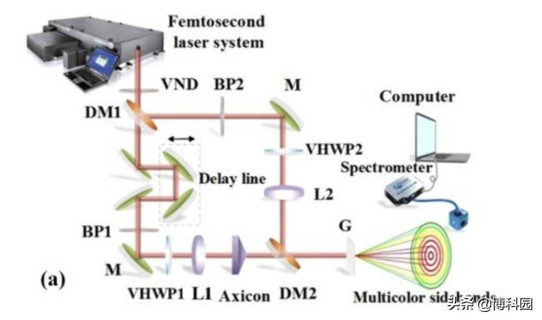 并同时实现了激光束的空间模式、偏振、波长和脉冲宽度的调制,其研究成果发表在《光学快报》上。在实验中,采用两束由两个涡旋半波片调制的径向偏振泵浦光束对玻璃板进行泵浦。当两束光束在空间域和时间域重叠时,显示出具有径向偏振的同心环形光束、宽光谱范围内的多色边带和飞秒脉冲宽度,观察到高达10个径向偏振频率上转换的宽带同心环状边带。研究发现,前7阶的光谱范围可以从545 nm延伸到725 nm,一阶边带的脉冲宽度测得为74fs。