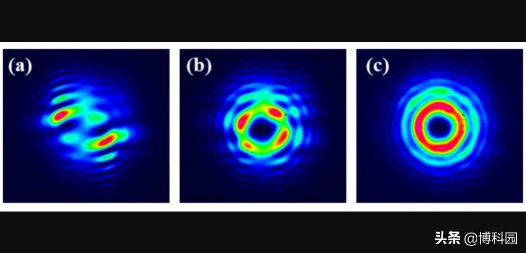 图示:用(A)未标定的方法,(B)干涉测量法和(C)所提出的方法,测量了旋涡相位在空间光调制器(SLM)上的衍射图。