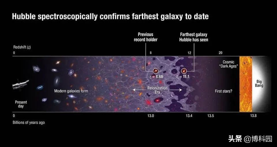 事实上,科学家们现在知道,不仅宇宙在膨胀,而且它的膨胀速度也在增加。这种神秘的效应,是由一种物理学家称之为暗能量的东西引起,尽管目前对暗能量知之甚少。天文学家还观测到一种叫做宇宙微波背景辐射的东西,这是一种存在于整个太空中非常低水平的能量,从这些测量中知道,我们的宇宙已有138.17亿年的历史,比地球要老得多,大约是地球的三倍。如果天文学家一直追溯到开始宇宙大爆炸: