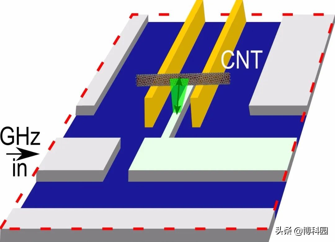 正常情况下,将碳纳米管等大分子的振动与微波耦合是很困难的。为什么?因为在量子计算或腔量子电动力学设备中使用的电磁波长,工作在GHz频率,在毫米范围内。一个典型的纳米管装置,既可用于捕获已知量子态的电子,也可用作振动谐振器,长度不到一微米,振动幅度低于一纳米。由于尺寸的不匹配,纳米管的运动,并不会对微波腔的电磁场产生太大影响,用标准光学力学理论预测耦合是最小的。