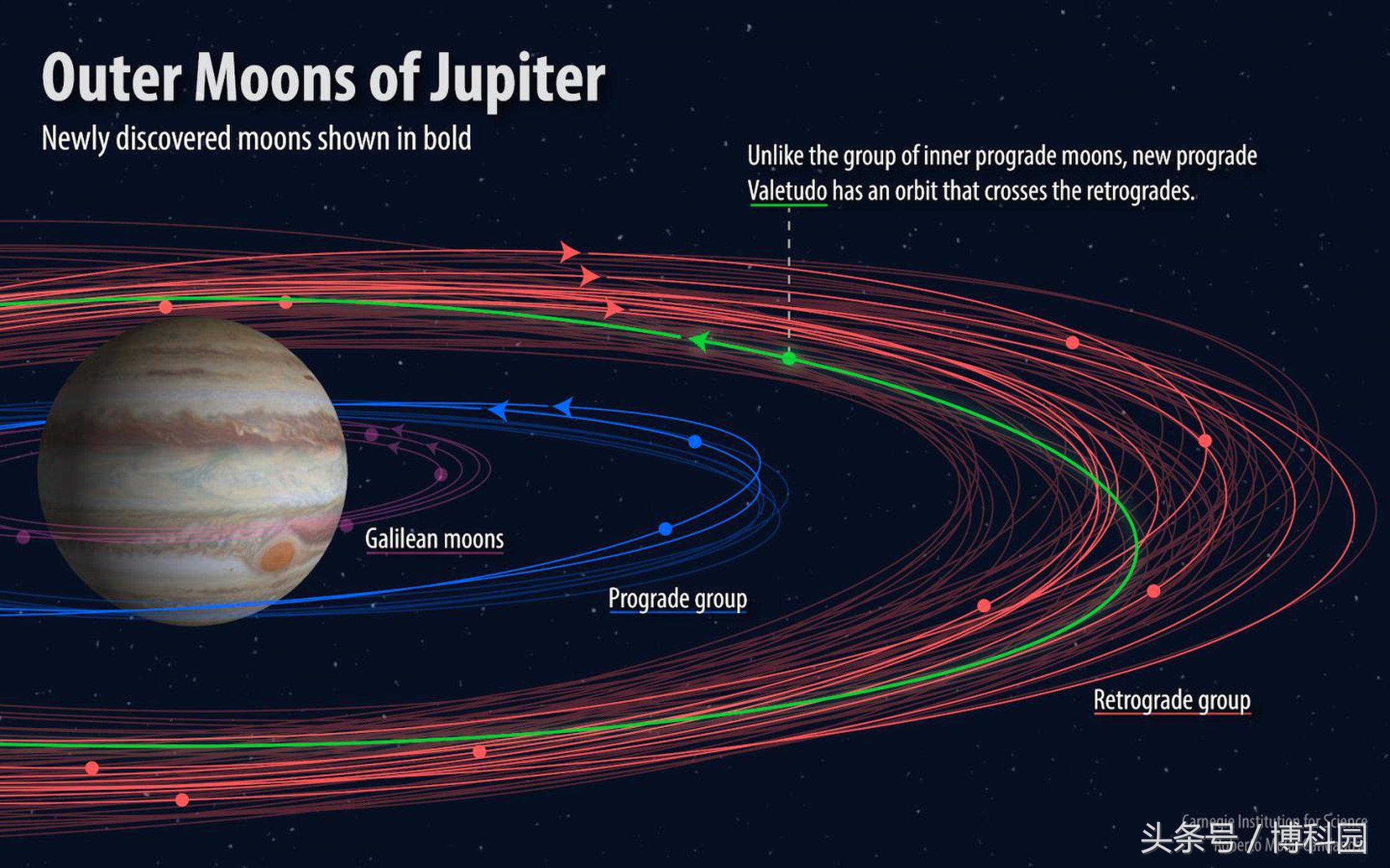 这张图片显示了围绕木星运行的不同卫星群,新发现的卫星用粗体显示。“古怪”的卫星,被称为“瓦列图多”,可以看到它在一个穿越逆行轨道的前进行轨道上呈绿色。图片:Roberto Molar-Candanosa, courtesy of Carnegie Institution for Science.