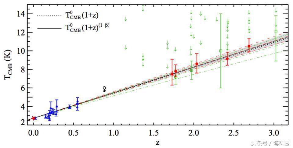 2011年的一项研究(红点)已经给出了迄今为止最好的证据,证明CMB过去的温度更高。远距离光的光谱和温度特征证实了我们生活在膨胀的空间中。图片:P. NOTERDAEME, P. PETITJEAN, R. SRIANAND, C. LEDOUX AND S. LOPEZ, (2011). ASTRONOMY & ASTROPHYSICS, 526, L7