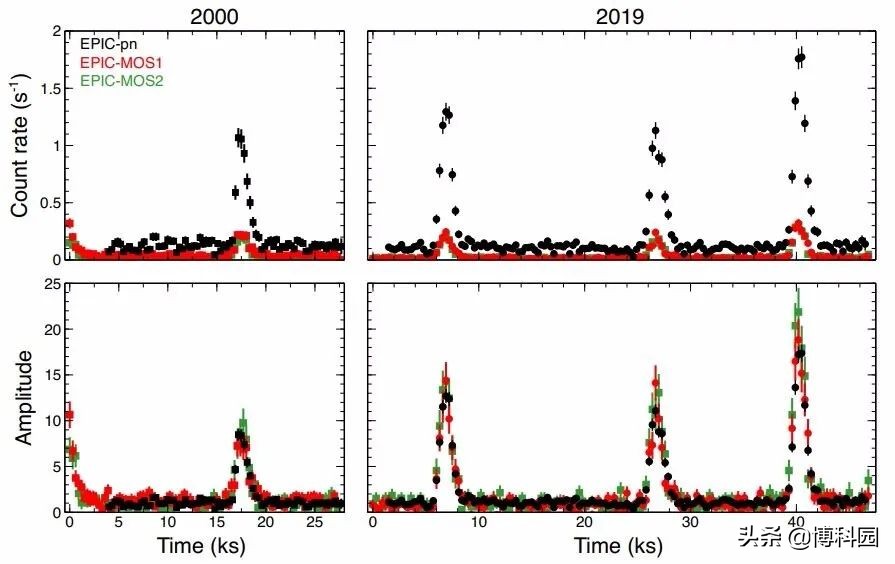 (上图所示)RX J1301.9+2747的背景校正光曲线,在2000年12月10日至11日(左图)和2019年5月30日至31日(右图),牛顿卫星观测期间,在0.2XMM 2keV波段用300s的时间柱提取。底部面板:计数率已正常化到静止水平;黑色EPIC-PN,红色EPIC-MOS1,绿色EPIC-MoS2数据。图片:Giustini et al