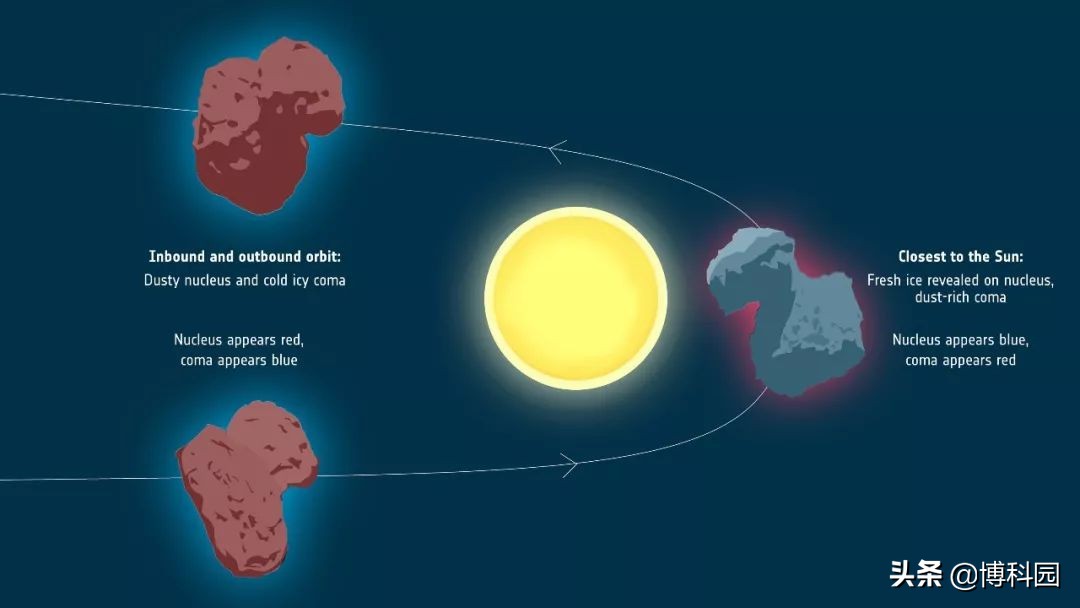 当彗星接近太阳时,热量增加,隐藏的水冰也开始升华,将尘埃颗粒赶走。这揭示了一层层原始的冰层,这使得原子核的颜色变得更蓝,就像VIRTIS所看到的那样。在彗核周围,情况正好相反。当彗星远离太阳时,彗星周围几乎没有尘埃,但那里含有水冰,因此显得更蓝。周围的尘埃云被称为彗发。当彗星越过雪线时,围绕核心尘埃颗粒中的冰迅速升华,只剩下脱水的尘埃颗粒。