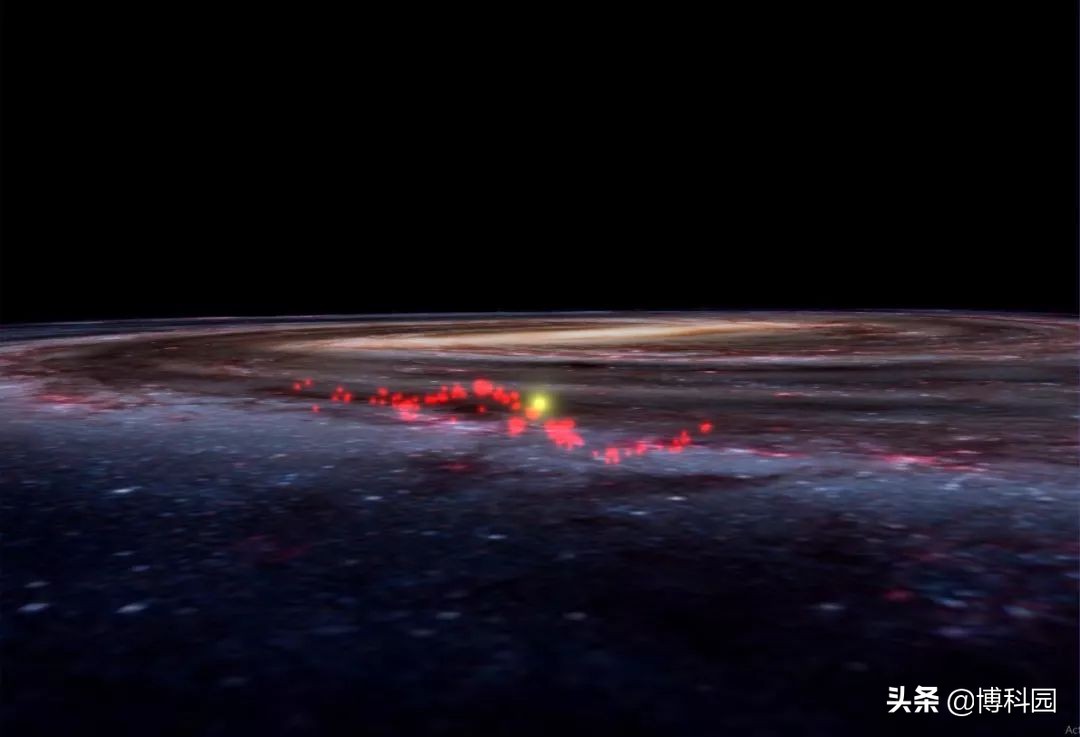 盖亚宇宙飞船卫星于2013年发射,任务是精确测量恒星的位置、距离和运动。研究小组将来自盖亚的超精确数据与其他测量结果结合起来,构建了一张详细的银河系星际物质3-D地图,并注意到离地球最近螺旋臂上出现了一种意想不到的模式。天文学家发现了一个细长的结构:长约9000光年,宽约400光年,呈波浪状,在我们银河系圆盘中面上下各500光年。“拉德克利夫波”包括许多以前被认为是“古尔德带”一部分的恒星托儿所。