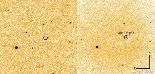 发现了余辉,左边是在爆炸前拍摄的一张照片,来自夏威夷的泛星望远镜。右边是一幅北欧光学望远镜拍摄的同一片天空的图像,爆炸发生几分钟后,Swift卫星记录下了爆炸。图片:Niels Bohr Institute
