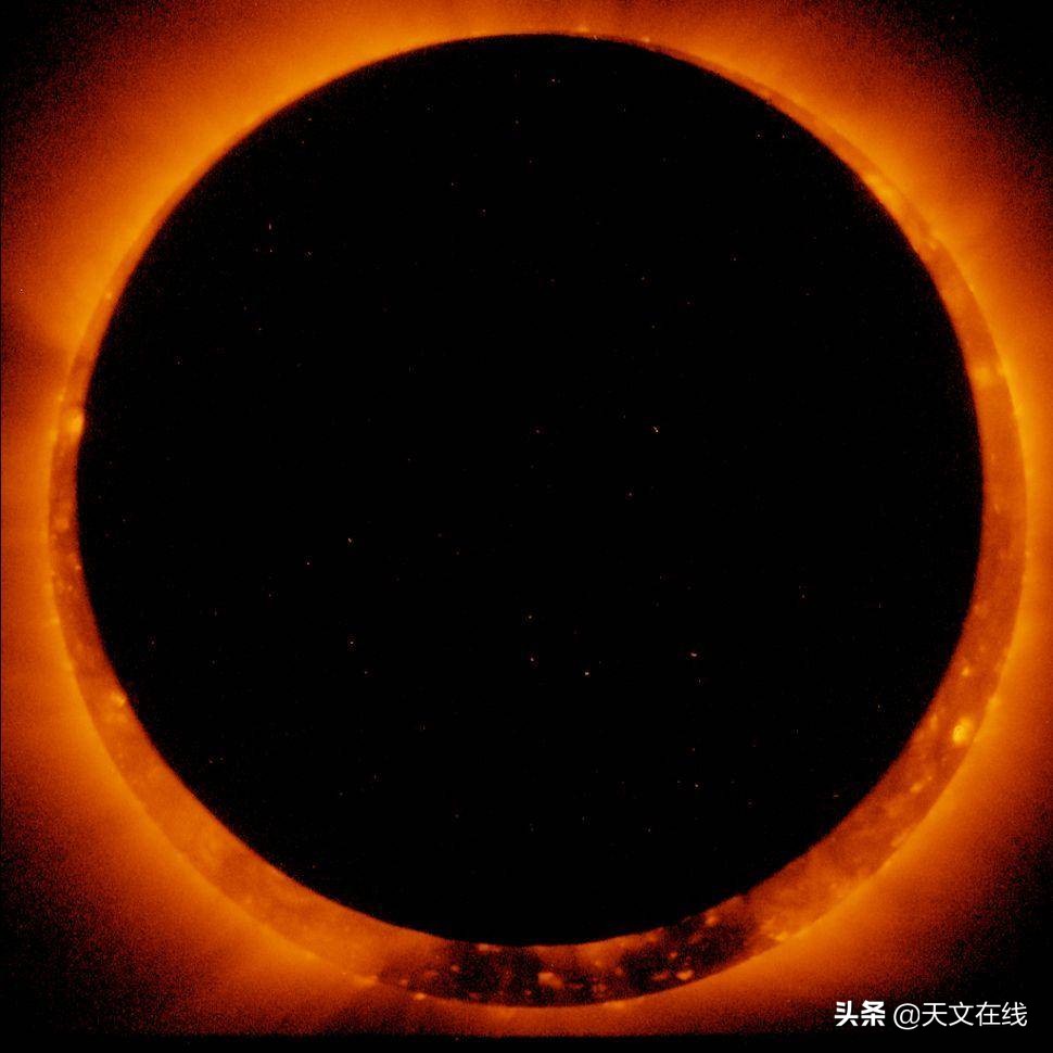 相反地,被称为伪本影的阴影会产生一道耀眼的太阳光环,你也可以看作一个围绕黑暗的月球剪影的“火环”。这便是一次日环食,它名字来源于拉语“ring-shaped”,意思是“环形的”。