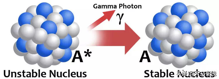 然而,在同一个原子中,使这些粒子在一起的能量并不强大,因此原子核变得不稳定,为了达到稳定的状态开始失去质子和中子。这一过程伴随着某种辐射的的产生。伽玛射线是伴随这种衰变所产生的辐射之一。