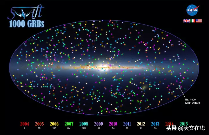 雨燕1000的位置由整个空中地图导向以至于整个星系(银河)的平面图,穿过了中心。爆炸以年份的不同颜色标记。(图源:美国航空航天局的戈达徳太空飞行中心和二微米巡天计画/ J•卡朋特,T•H贾雷特和R•赫特)