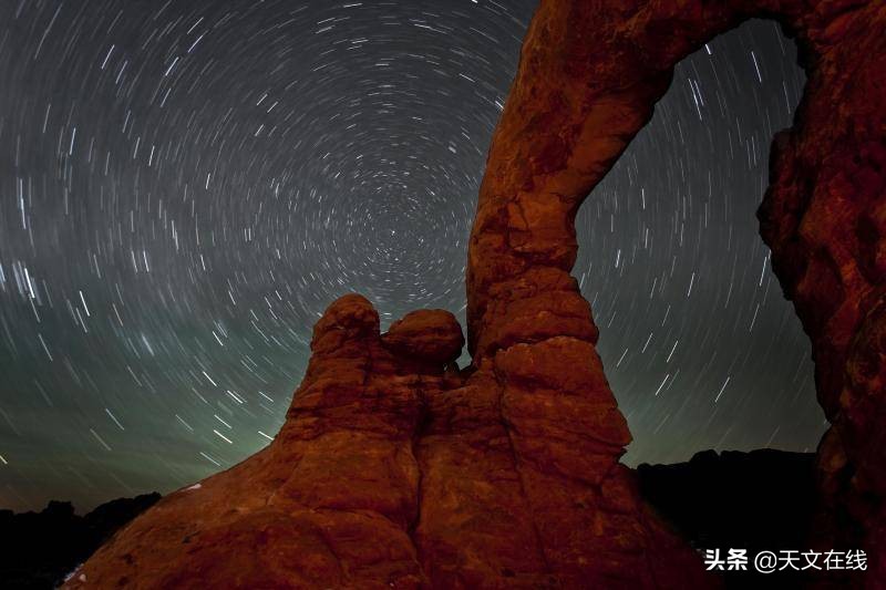 星星们由于地球自转产生了运动模糊。然而我们的眼睛足够快而这种模糊太小以至于无法察觉。公共领域图像,资源:美国国家公园管理局。