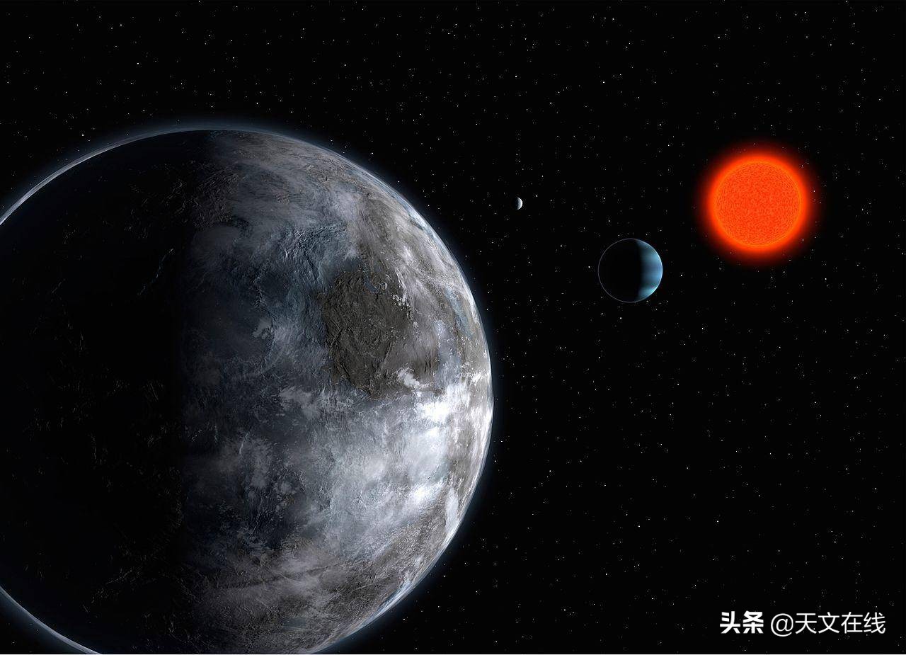 图解:艺术家笔下的格利泽581c(前)、格利泽581b(中)、格利泽581d(后)以及它们的母恒星格利泽581。