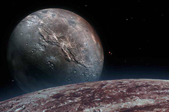 (图解:冥王星表面的景象,前方为冥王星的卫星冥卫一,也叫做“卡戎”;图源:纽约时报)