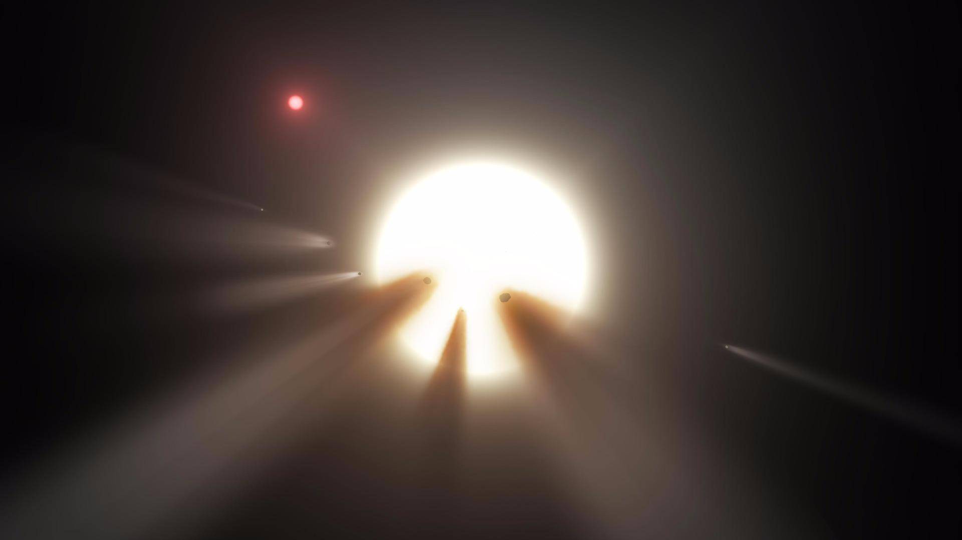 第一个奇怪之处是詹姆斯·达文波特和戴维·威尔逊在推特上发的东西,虽然它们可能毫无意义。如果研究这颗恒星几年前的星系数据,似乎能从数据中发现一种大约持续80秒的模式。这通常会让仪器发出刺耳的噪音,但很明显,它并没有在附近的恒星上出现过,所以,如果它确实表明了这颗恒星的一个真实特征,那么到底是什么就不得而知了。第二个奇怪的地方是,开普勒望远镜的数据中出现了88天的波动。博亚吉安和她的同事提出,这是恒星自身旋转的象征。