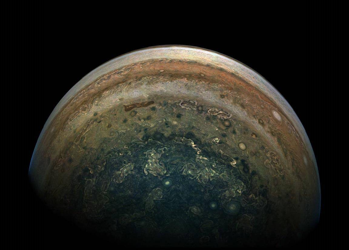 自进入木星轨道以来,“朱诺”号展示给我们的其他重大惊喜还包括发现了位于每个极点的气旋群。当探测器第一次环绕地球时,从一个极点到另一个极点,探测器上的仪器都能看到可见光和红外波段的图像。“朱诺”是历史上第一个以这种方式环绕地球的太空探测器,这些风暴之前也是不为科学家们所知的。