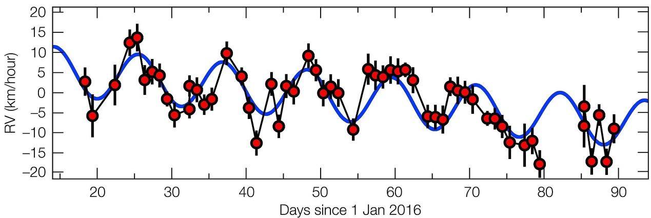 图解:HARPS自2016年1月1日起对比邻星相对于地球接近与远离的径向速度观测三个月的结果。带有黑色误差杠的红点代表每次观测的资料点,蓝色曲线则是资料拟合曲线。径向速度曲线的振幅和周期则可用来推估行星的质量下限。