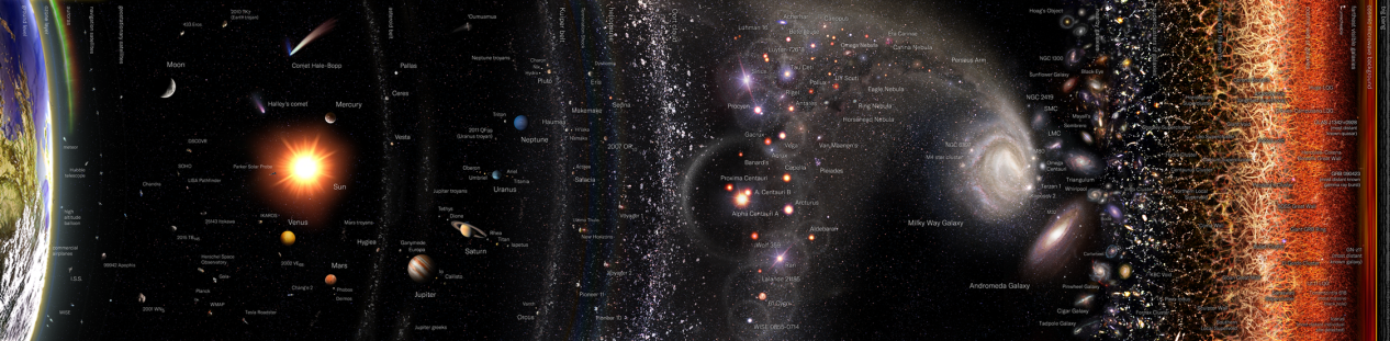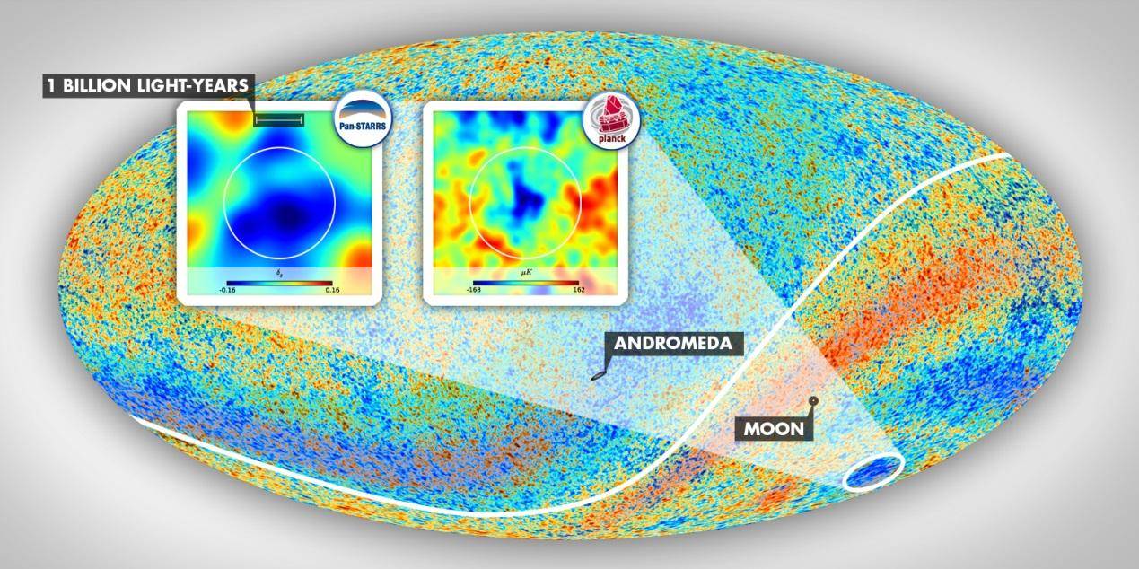 这意味着在宇宙背景辐射中有着这样的辐射波动,它能表明有些东西太冷或太热。从这来看,它可以是物质也就是气体,陷入引力场或一个什么都没有的地方。什么都没有。冷可以指“冷”:那里什么都没有。但是当宇宙38万岁的时候点能有多大呢?好吧,这个答案相当简单。38万年乘以光速是38万光年。那时应该没有什么比38万年的宇宙更大的了。但是如果你转化一下这个巨大的点到底有多大,你就会发现它比38万光年要大得多。