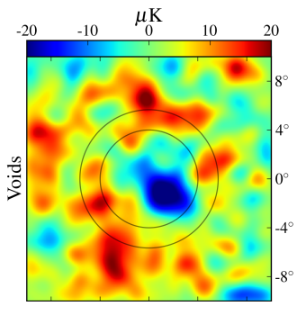 图解:宇宙微波背景上平均有50个ISW印记超级空洞:色阶从-20到+20微克。