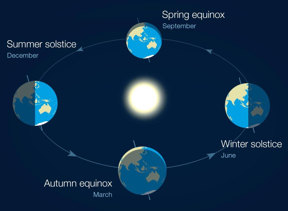 但是事实上,地轴有23.5度的倾角。因此,黄道相对于天球赤道也倾斜了23.5度。那么会发生什么呢?以秋分点为例,如果倾角为零,那么太阳每天都会沿着天球赤道运动(这是由于地球围绕太阳公转而引起的运动,而不是地球绕其轴心自转产生的)。但是由于实际上的倾角为23.5度,太阳会与天赤道成23.5度角的轨迹移动,或者同时向南和东方向运动。