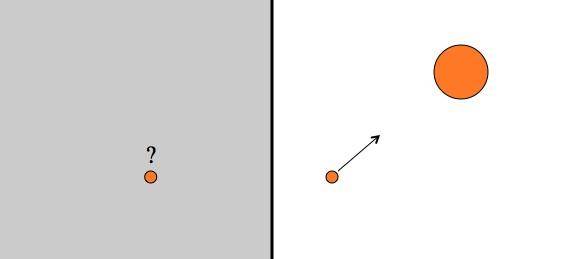 图解:普通物质聚集在一起,因此当它对外物施于引力的时候,受力物体只会收到一个方向的力(图右)。暗物质也会对外物施予引力,但它是在每个方向均匀地拉着每个粒子,因此效果几乎和没对物体施力一样(图左)。