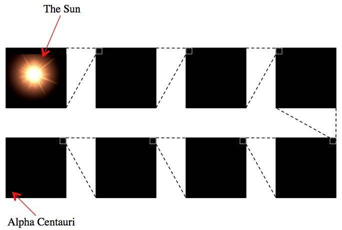 图解:任何试图给太阳及其附近恒星拍照进行测量的行为结果看起来都是一无所获。这是就一次尝试,其中每一个正方形都是前一个正方形大小的10倍(1000倍的体积)。重点是,当普通物质聚集时,它们是货真价实的聚集在一起。