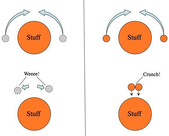 图解 :如果你有一大团物质,(是什么无所谓),那么暗物质与普通物质都会受到引力的作用,然而,由于周围没有物体阻止其运动,暗物质是不会从引力轨道上脱落下来的。正常的物质则会自己挡自己的路。