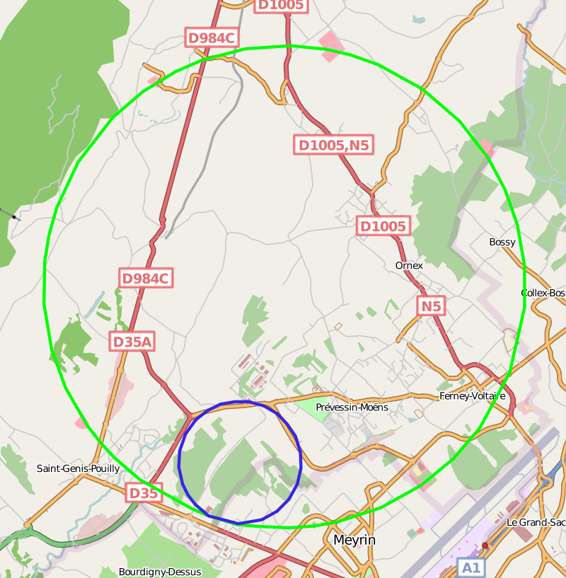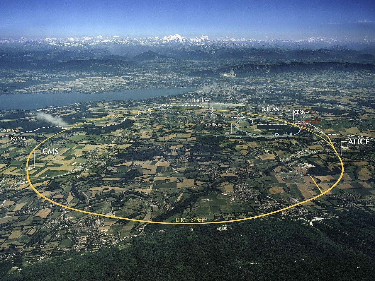 图解:CERN大型强子对撞机平面位置图,圆形轨道位于日内瓦机场西北方