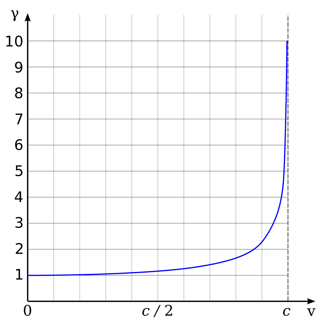 图解:洛伦兹因子γ作为速率v的函数。因子从1开始,并随着v趋向c而趋向无限大。