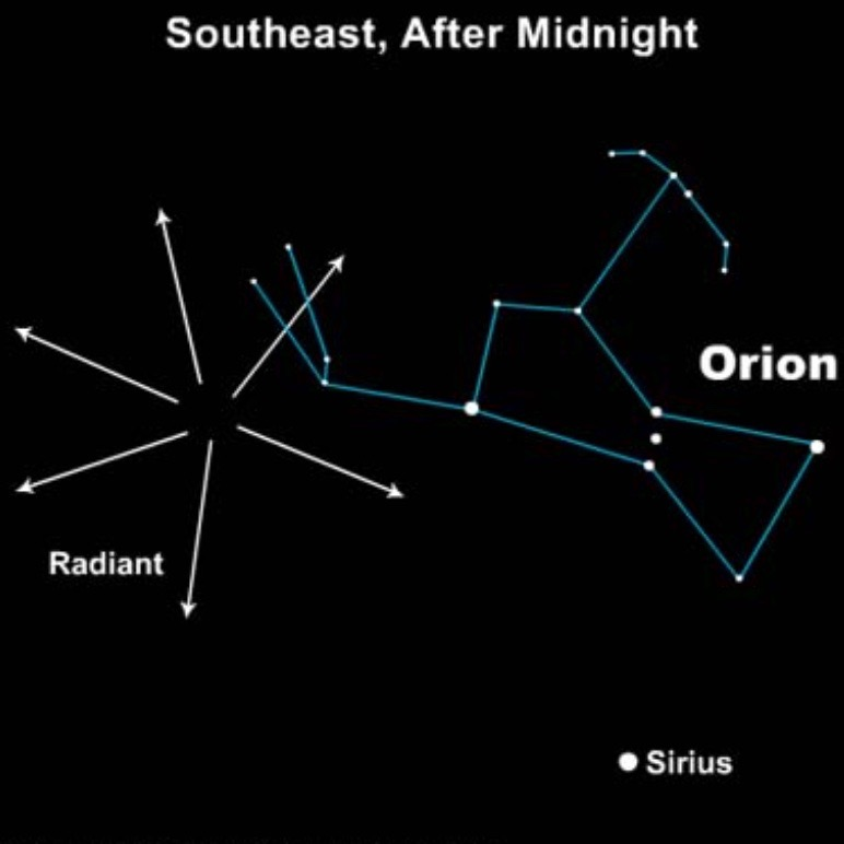 猎户座流星雨的辐射点就在猎户座的北部,猎户座的附近。很多人认为猎户座的猎人是一个巨大的矩形。你一定注意到它中间那排独特的三颗中等亮度的星星,它们代表了猎户座的腰带。夜空中最亮的星星,天狼星,天穹之上它坐落在猎户座的东南部,而猎户座的腰带三星总是指向这颗最明亮的星星。这个星座将于午夜之后出现在夜空的东南部,并于黎明时分出现在南方的夜空里。接下来的数月里,我们将对猎户座有更多的介绍和了解,因为它是冬季里最著名的星座之一。