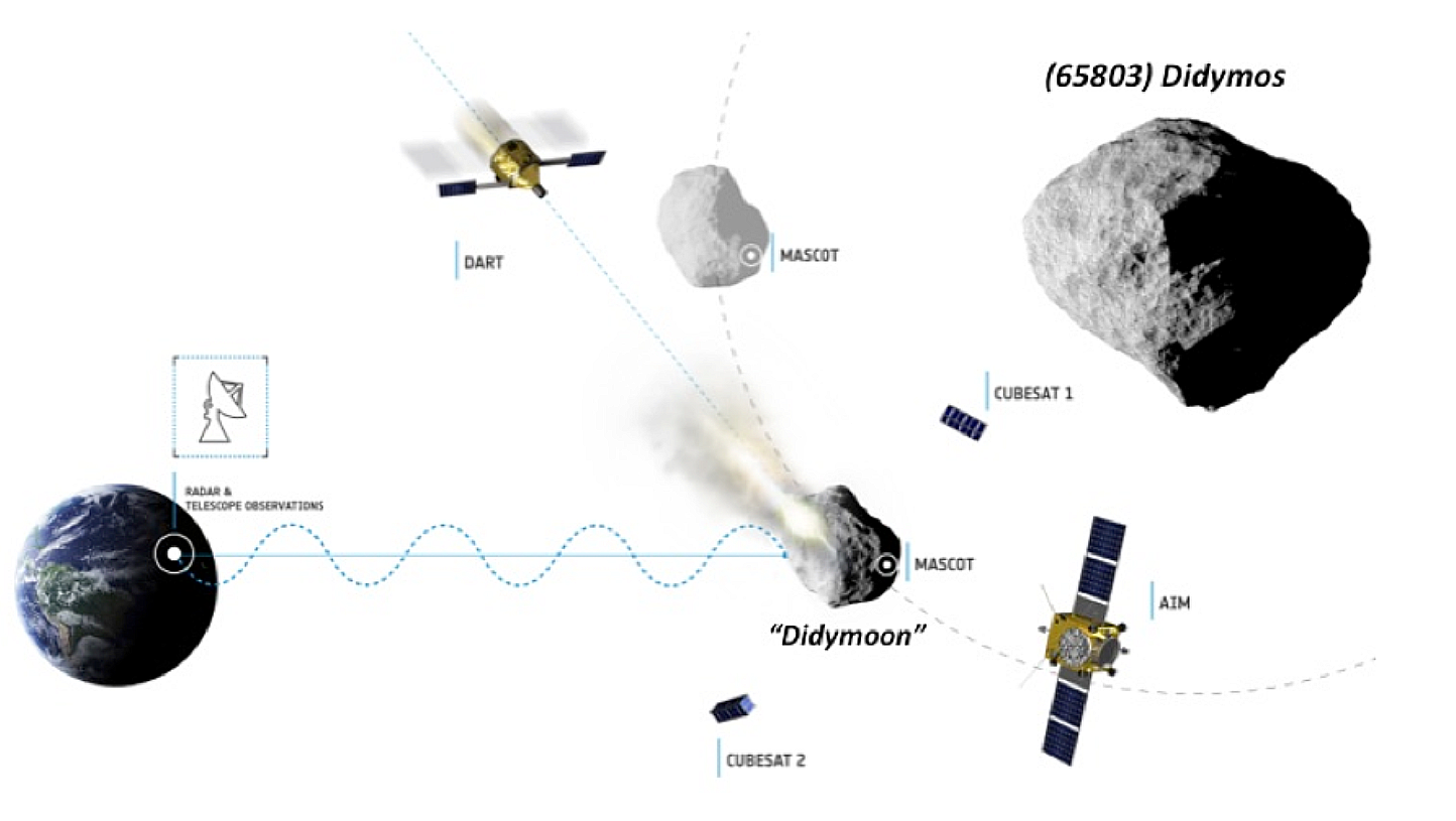 图解:显示任务进度的示意图。在目前的提议中,aim被hera取代,没有吉祥物,cubesats现在被设想为6u而不是3u。