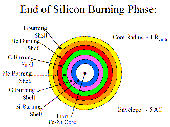 超新星是恒星演化的终极阶段,其质量大约是太阳的6倍。参宿四就是这样的一颗恒星,它可能离生命的终结只有几百万年的时间。猎户座和昴宿星团中的许多恒星也比这更大。这就是我们所推测的离爆炸点不远的恒星内部的情况。