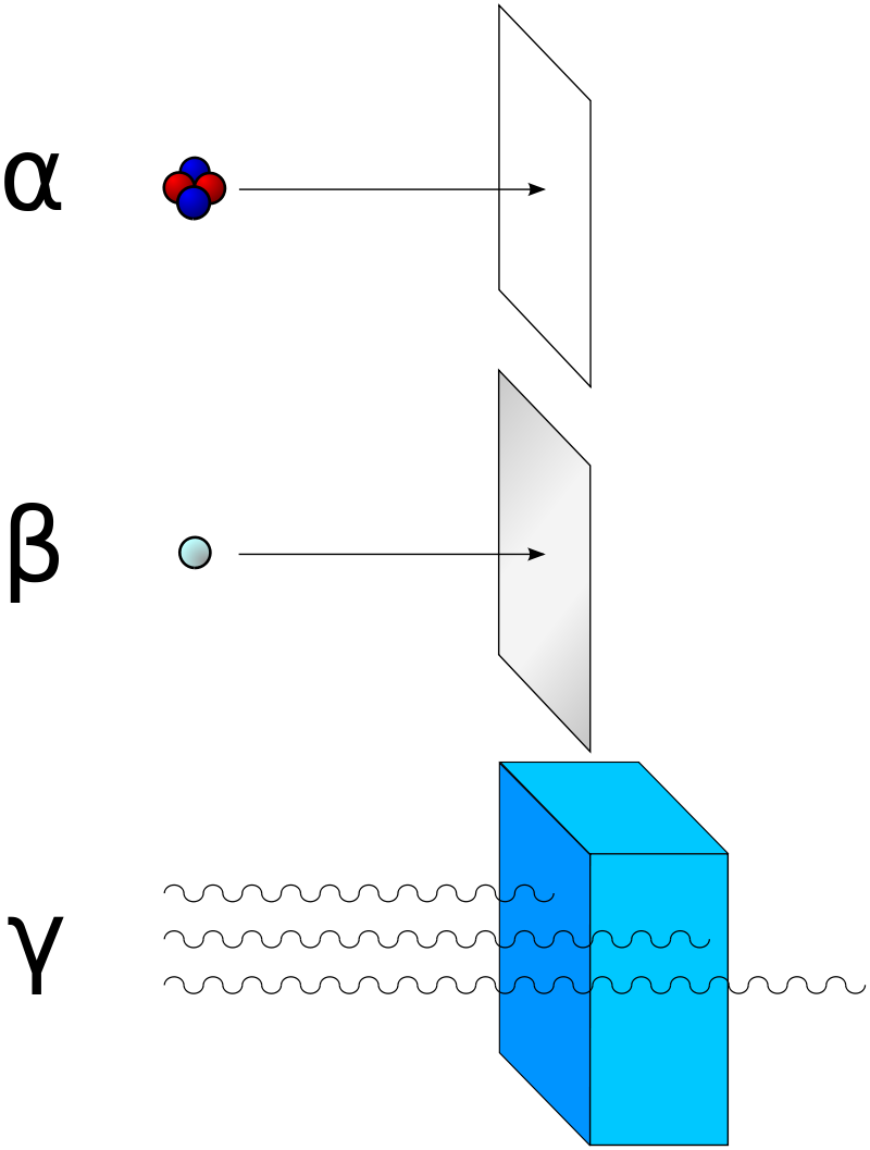图解:α粒子相当于氦的原子核可被纸所阻挡,β粒子相当于电子可被铝箔所阻挡,γ射线则具有高穿透性。