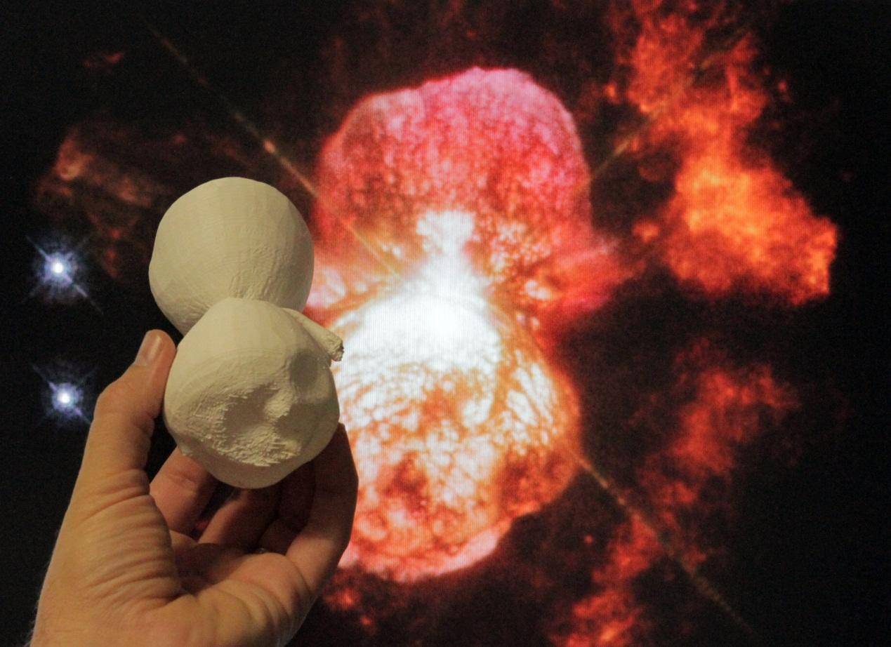 上图所示是哈勃空间望远镜拍摄到的船底座伊塔星(或称船底座海山二星),是一颗质量非常大的恒星(相当于太阳的100倍),它看起来生命已经非常接近尾声,大约在未来10万年左右将成为一颗超新星。自19世纪以来,已经有几次有记录的小规模爆发,它会喷发出巨大的气体云。上图显示的是一个倾斜的沙漏形状的气泡。