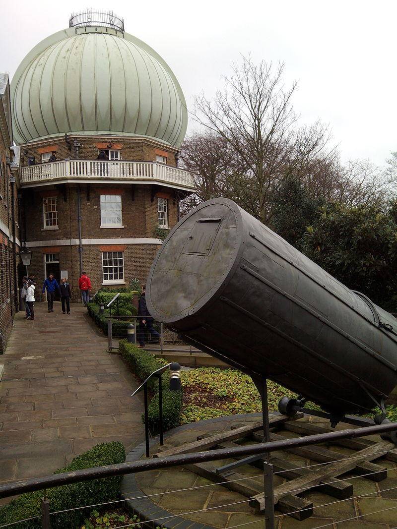 图解:格林威治皇家天文台”洋葱”式的圆顶内安放的是28英寸的折射望远镜。在前景中的是口径120公分(47英寸)的威廉·赫歇尔反射望远镜(由于它的焦距长度,被称为”40英尺望远镜”)剩余部分。