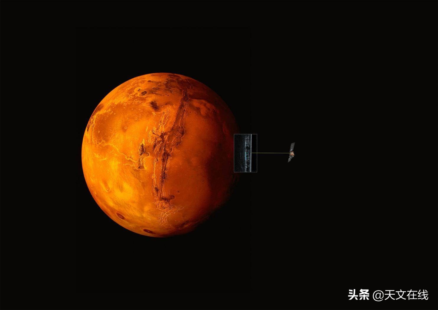 艺术家对“火星快车”飞船用雷达扫描火星地形的印象,来源自:欧洲航天局(ESA) /意国家天体物理研究所(INAF) /大卫·科罗·博吉亚(DAVID COERO BORGIA)