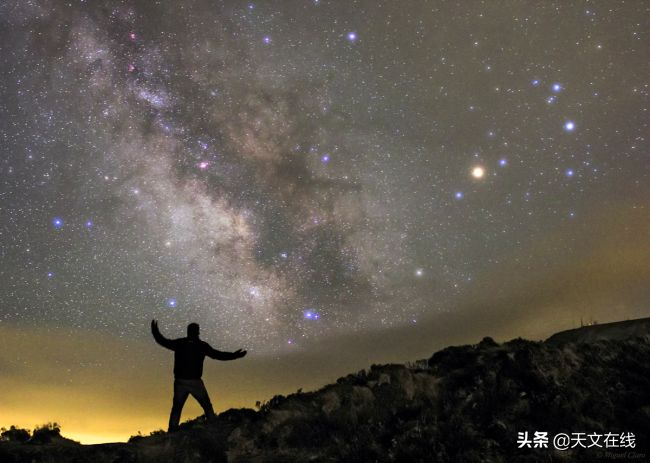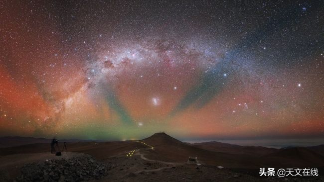 这张图片是欧洲南方天文台的可见光和红外观测望远镜(VISTA)拍摄的,并且在远处能勉强看到坐落于帕拉纳尔山顶的超大望远镜(VLT)。