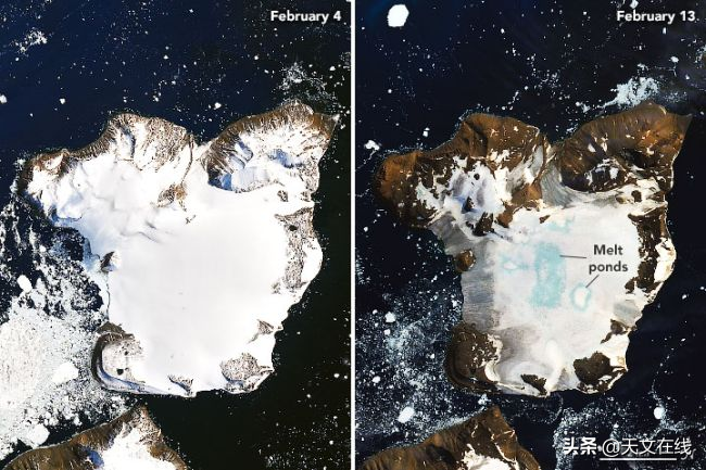 通过这个信息可知,在2020年2月4日到2月13日期间,南极鹰岛冰川急剧减少。根据美国卫星NASA's Landsat-8 satellite显示,该岛位于南极洲的西北部。南极洲大陆已经经历了两次高温浪潮(2019年11月和2020年2月),并且在这个月有明显两次的高温。