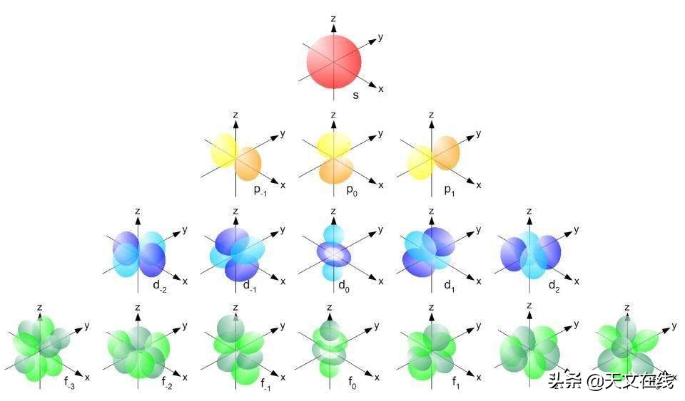 图解:原子轨道处于基态(左上角),下一个能量最低的状态随着你向右和向下移动出现。这些基本的配置决定了这些原子如何表现和原子间作用力。(维基百科关于原子轨迹的页面)
