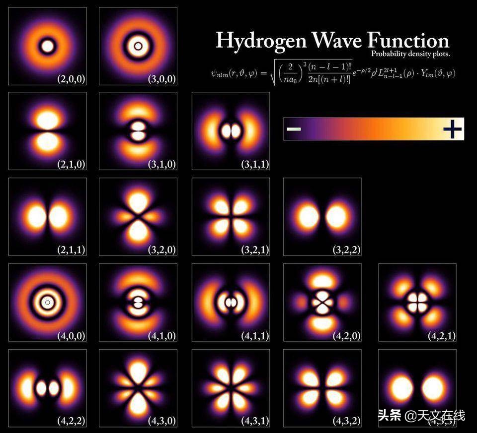 图解:能量级和电子波函数对应氢原子内的不同状态,尽管所有的原子结构都极其的相似。能量级由普朗克常数倍数量化,但是轨道内原子的大小由基态能量和电子质量决定。额外的影响可能是非常微小的,但是可以通过可以衡量的、可以量化的方式来概念能量级。(POORLENO OF WIKIMEDIA COMMONS)